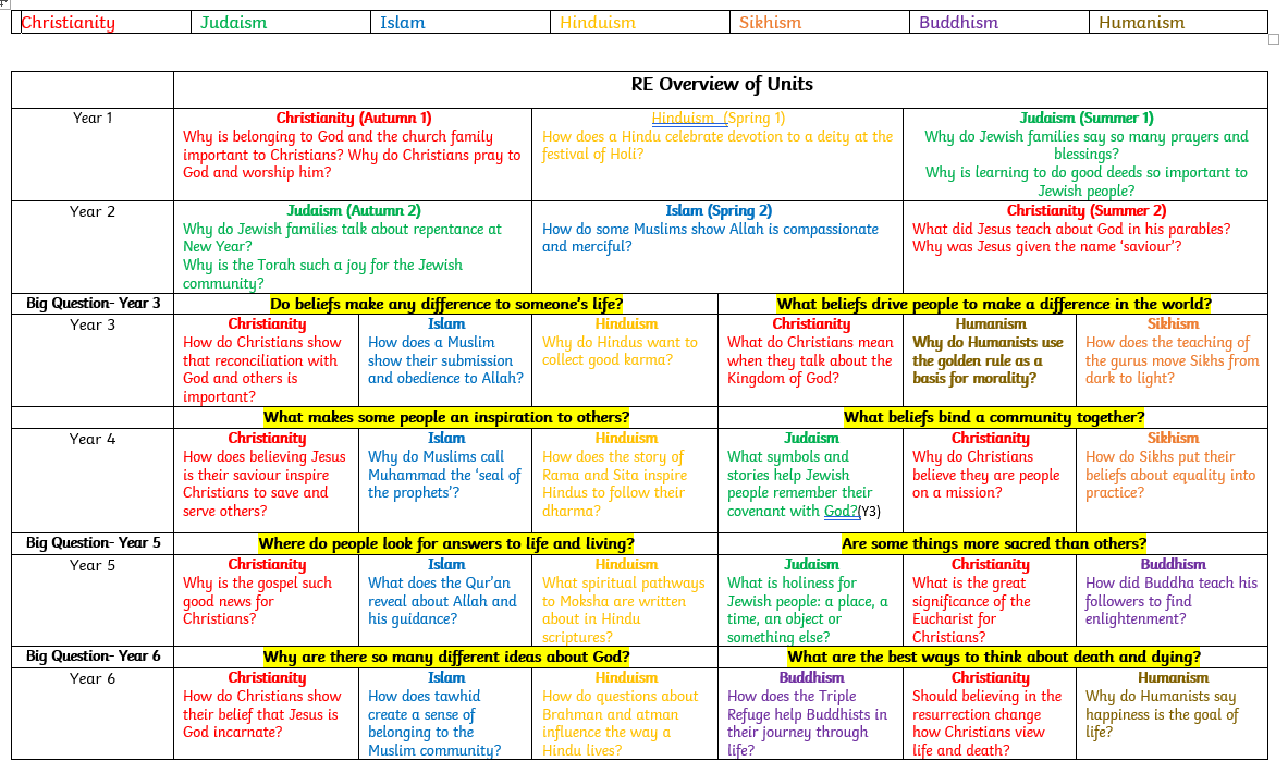 Over the year in Key Stage 2, each year group will have ‘Big Questions’ which will allow the opportunity to compare across religions and world views. Key stage 2 deliver 6 units of RE per year.